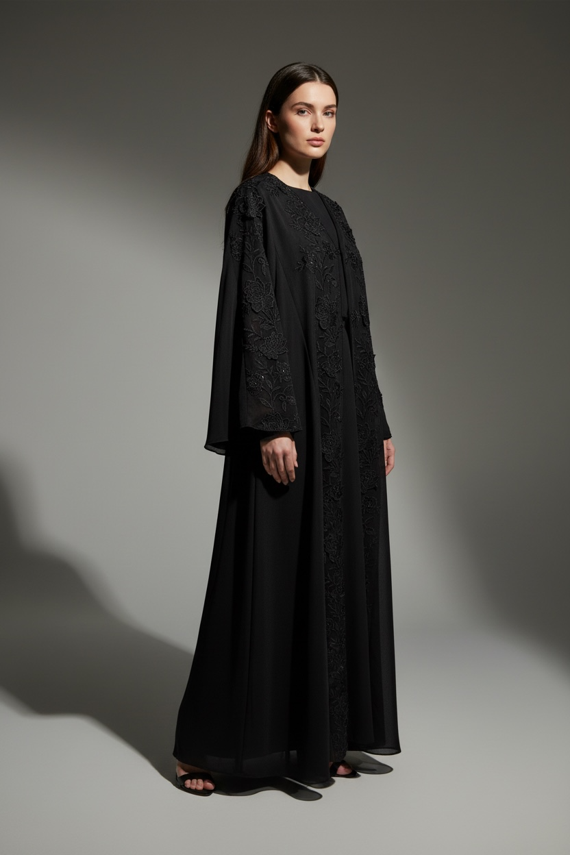 A charcoal black abaya with a sleek inner layer and a sheer floral overlay, designed for a refined and modern elegant look.